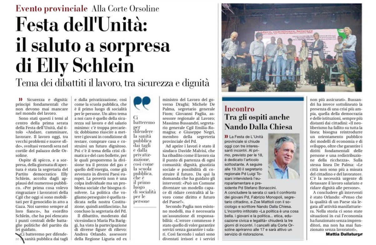 E ancora oggi, in una società frammentata, in un tempo di connessioni virtuali e solitudini molto reali, le Feste restano un avamposto: un presidio di socialità e di democrazia, specialmente nelle aree interne del nostro Paese, e allora voglio rivolgermi con infinita riconoscenza alle volontarie e ai volontari, ai nostri militanti, ai segretari di circolo e di federazione, a quelli regionali e tutti i nostri amministratori e consiglieri, ai nostri parlamentari e ai dipendenti del nostro Partito: Grazie! Grazie! Grazie!